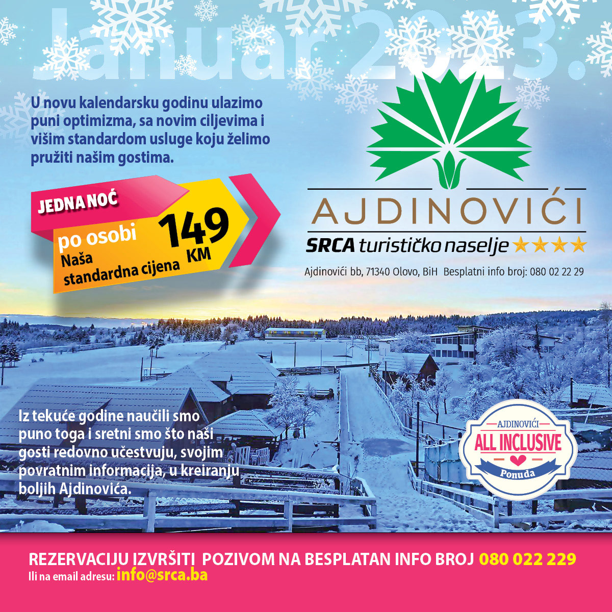 All inclusive aranžman četiri noći/pet dana (ponedjeljak - petak) za dvije odrasle osobe + djeca do 15 godina gratis po cijeni od 650 KM. Broj djece je neograničen u jednoj smještajnoj jedinici. PAKETI ZA DVIJE OSOBE Novu 2023. godinu i januarsku ponudu upotpunit ćemo paketima dvije noći/tri dana za dvije osobe. Želimo Ajdinoviće približiti svim skupinama i na tome ćemo raditi u narednim mjesecima sa novim paketima i popustima za naše goste.