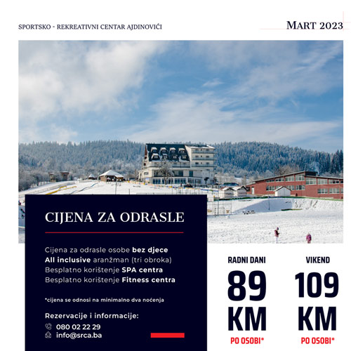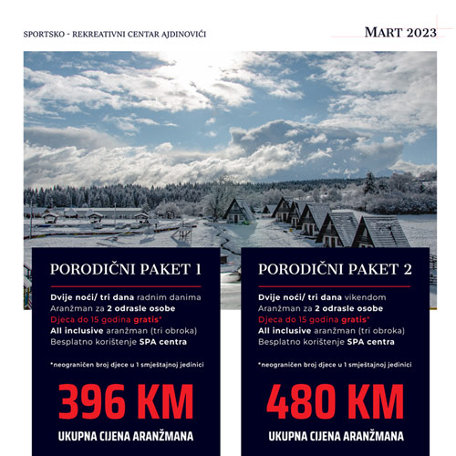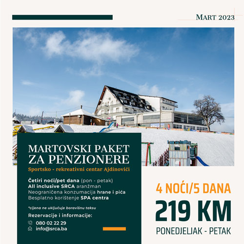 All inclusive aranžman dvije noći/tri dana vikendom za dvije odrasle osobe + djeca do 15 godina gratis po cijeni od 480 KM. Broj djece je neograničen u jednoj smještajnoj jedinici. U mjesecu martu, svim licima koji korisnici penzije i njihovim bračnim partnerima nudimo specijalan paket: 219 KM po osobi za četiri noći/pet dana, ponedjeljak - petak u mjesecu martu uz all inclusive aranžman. Sve što je potrebno jeste rezervacija i posljednji ček od penzije koji je potrebno priložiti pri dolasku na recepciju hotel. All inclusive aranžman uključuje tri obroka na bazi švedskog stola, tople i hladne napitke, alkoholna pića, korištenje SPA i wellness centra, fitness centra, animacijski program za djecu, posjeta zoološkom vrtu i farmi. |