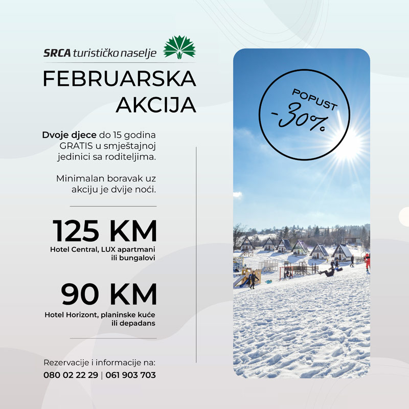 Nastavljamo sa snježnim akcijama i pogodnostima za naše goste. U mjesecu februaru fantastično sniženje od 30 posto na redovne cijene za boravak od minimalno dvije noći te dvoje djece do 15 godina gratis u sobi sa roditeljima.